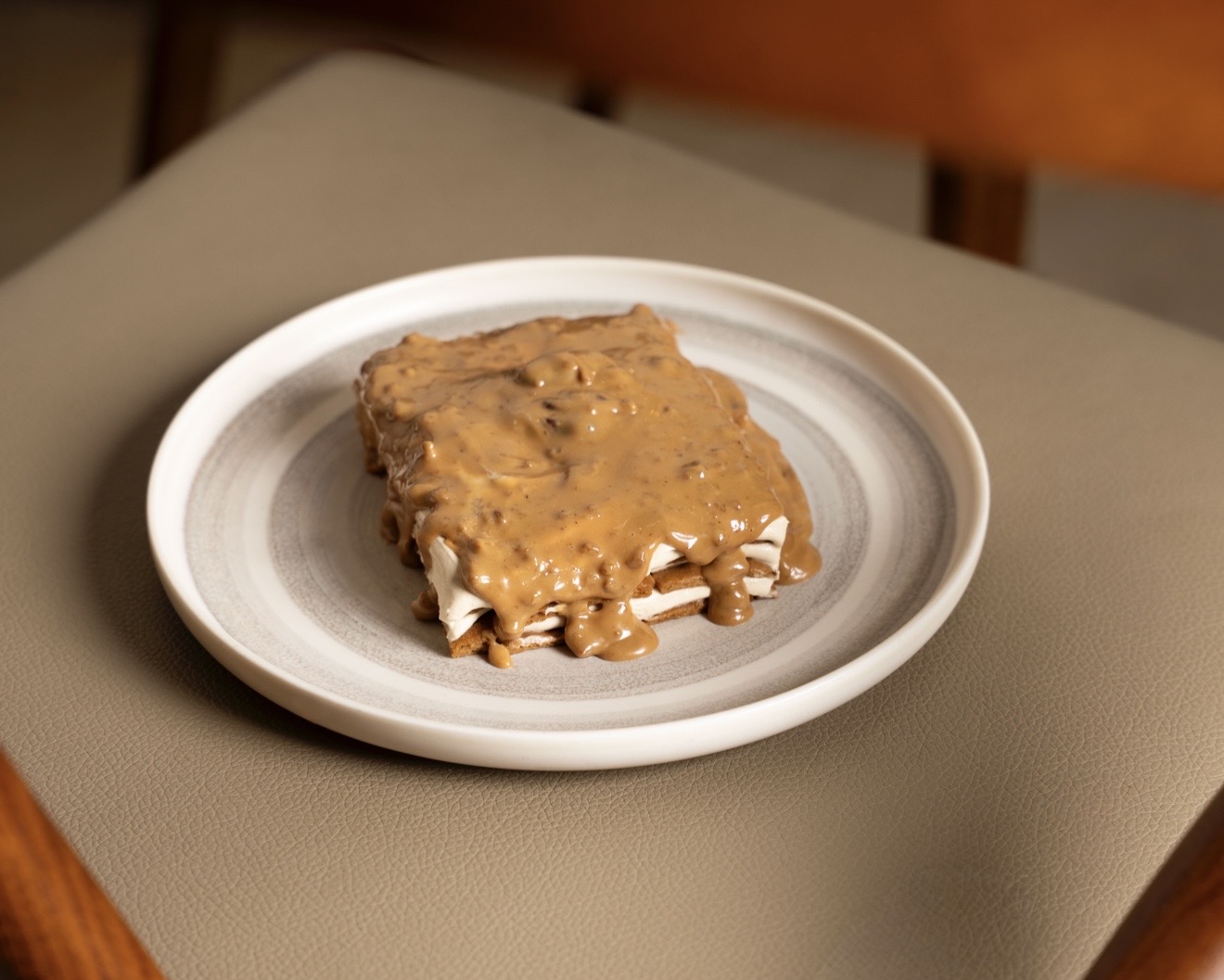(460 سعرة حرارية)طبقات الحلى المنوعه بالكريمة والبيكان والكنافة المقرمشة المغطاة بالشوكلاته البلجيكية .